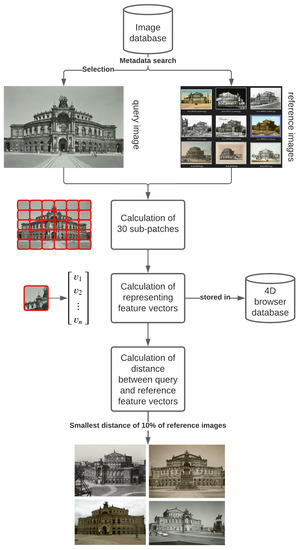 As a starting point, a specific keyword is selected to narrow the search in the image database and limit the computation time for the CBIR. In the presented research, the keywords are Semperoper and Taschenbergpalais, as shown in Section 4.