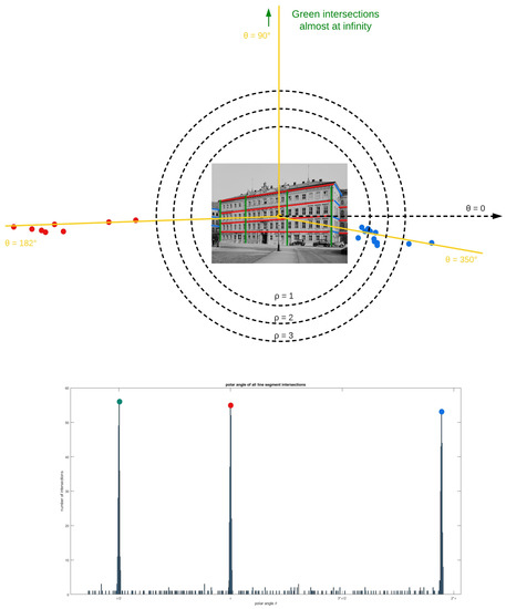 The proposed method uses vanishing point detection (VPD) for initializing the principal distance. The approach is based on [32] and refined in [12], where images are filtered out if they do not provide three significant vanishing points (VPs). Some additional modifications were made in the following. For initialization, a pinhole camera model is assumed so that parallel lines in object space are projected to a set of lines in image space. The advantage of the method on the presented data is that parallel lines often exist in man-made (urban) structures. In the following, all possible pairs of lines are intersected. With the assumption that the principal point is in the image center, a polar coordinate system is spanned using that point as the origin (Figure 5-top). The three angles of the VPs can be easily determined using the polar coordinates in a histogram using a finite number of bins (Figure 5-bottom). Therefore, the infinite accumulator space from 0 to of the angle is discretized into 720 bins (i.e., two bins for one degree).