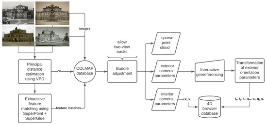 This toolbox is also used to initialize all values for the determined principal distances of the cameras and all feature matches in a single COLMAP project. COLMAP is an open-source SfM software solution allowing, i.e., the import of different feature-matching methods [4]. In order to generate a sparse point cloud, all exterior and interior camera parameters are optimized in a single bundle adjustment procedure. It is recommended to use two-view tracks for historical photographs, which means that the camera parameters are estimated even if feature matches between one single image pair (=a feature track between only two images) only exist.