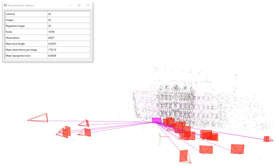 As far as all 584 hits in the Deutsche Fotothek were observed, LEA did not omit any relevant hits that should be included in the SfM process. The majority of the 584 images (including drawings and plans) show the building’s interior or an extremely destroyed building state after 1945, which is not relevant for the reconstruction. That means less than 4% of the metadata search hits show the desired perspective, emphasizing the use of CBIR followed by SfM. For all images, it is desirable to use only the relevant photographs for the SfM reconstruction. However, SuperPoint + SuperGlue is even capable of matching geometrically correct drawings to photographs. Thus, it is expected to estimate the camera parameters of 22 to 30 images/drawings. Of course, in the case of drawings, the camera cannot be connected to a physical model but can be seen as a virtual camera for which the parameter errors are minimized during bundle adjustment. The final reconstruction in COLMAP shows 26 registered images, including 3 drawings (Figure 7).