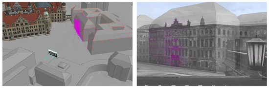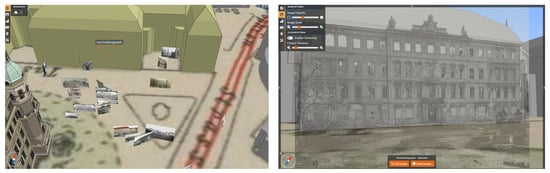 Nonetheless, all camera parameters are transferred to the 4D browser after georeferencing using the sparse cloud and a LOD 3 model of Taschenbergpalais by selecting 15 corresponding points (Figure 9-left). The accuracy of the transformation between the 3D model and sparse cloud yields = 1.12 m with a maximum deviation in XYZ of 3.52 m. It was not possible to achieve higher accuracy, even when selecting more points or changing the distribution of similar points.