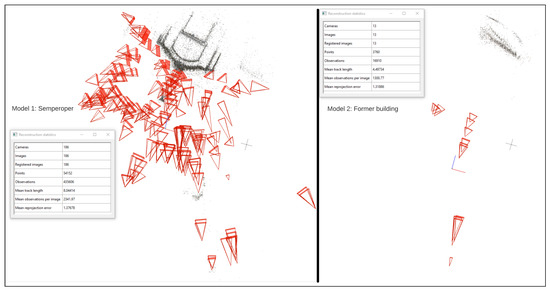 In this section, all results for the two investigated datasets are shown. This includes the results of the CBIR, the SfM workflow, and the final visual representation in the 4D browser. The results can be directly visited via https://4dbrowser.urbanhistory4d.org, accessed on 1 February 2023. The 3D scene of Dresden has to be opened. Via the metadata search, it is possible to filter for Taschenbergpalais or Semperoper. Images showing the respective views of the two buildings are oriented using the proposed workflow. Double-clicking on a single image allows one to jump into the perspective of the photographer and get an estimate of the visual accuracy. The underlying 3D model can be made visible by using the Image Opacity slider on the top left of the web page.