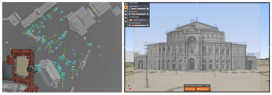 As for the other dataset, it is expected that all 178 relevant photographs can be oriented in the automatic SfM workflow using SuperPoint + SuperGlue feature matching. However, the first result shows inaccuracies in the reconstruction introduced by a small number of mismatches between some image pairs (Figure 11). While the images depicting the Semperoper in its contemporary state are positioned correctly, COLMAP also merges seven images of the Hofkirche (located across from the Semperoper building) and 15 images of the former opera house into the reconstruction, likely introducing errors to the other photographs. Additionally, these buildings are not located in the correct global positions.