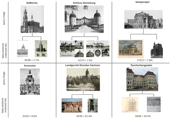 Metadata search tag and query image for six different landmarks in the vicinity of Dresden. Below every landmark, two examples and the absolute number of false positives retrieved by LEA are given. An especially high number of false positives can be seen for the smaller Landgericht and Taschenbergpalais datasets. These occur because there are no other relevant hits in the image repository.