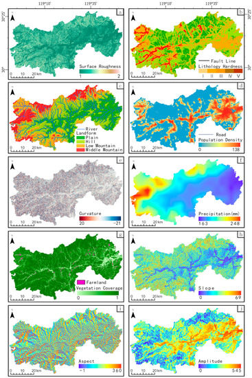 The identification of the main controlling factors of landslide disasters plays an indispensable role in landslide occurrence prediction and risk assessment [41]. Generally, the influencing factors are divided into stable condition factors and triggering condition factors [48], and stable conditions can be further divided into material conditions and topographic conditions [42]. In this study, we mainly selected the stable condition factors, because our assessment emphasizes the possibility of landslides under long-term stable geological conditions, while the triggering condition factors mainly emphasize the possibility of disasters under a short-term influence [43]. Based on previous research, thirteen landslide condition factors were selected, including slope, aspect, curvature, surface roughness, relief amplitude, landform, lithology, vegetation coverage, distance to fault, distance to road, distance to river, population density, and precipitation (average monthly precipitation). The data sources and characteristics are shown in Table 1, and the spatial distribution patterns of some key factors are shown in Figure 2.