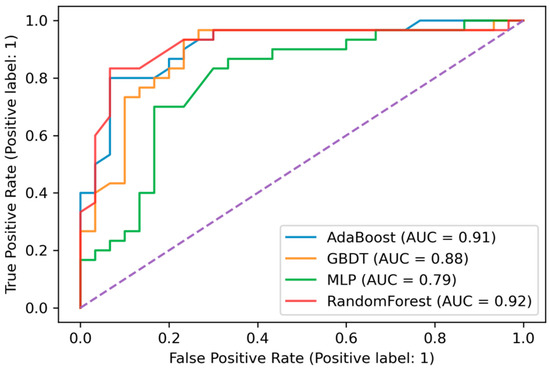 The four models should be first optimized by selecting the appropriate hyperparameters. Commonly used hyperparameter optimization methods include grid search, cross-validation, and random search [68,69]. In this study, grid search and K-fold cross-validation were applied to select the optimal hyperparameters for the models in the training–development set (Table 2). These optimal hyperparameters are obtained by achieving the highest mean testing accuracy in K-fold validation. The hidden layer for MLP is set to one layer containing four neurons with the Adam optimizer as its optimization algorithm. Epoch refers to how many cycles through the full training dataset, and batch size represents the number of samples per gradient update. The RF method uses a total of 17 trees, 3 maximum feature numbers for each tree, and 3 minimum numbers of samples. AdaBoost and GBDT use 40 and 17 trees, respectively. The more trees denote a more complex model and more powerful ability of data training. However, too many trees are prone to be overfiting when the models are trained by a small dataset. Considering our training data size, we established these parameters for four methods.