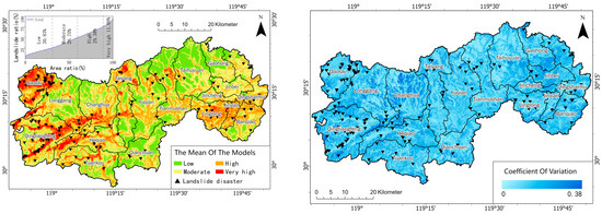 The mean landslide susceptibility levels (left) predicted by the four models and the coefficient of variance (CV; right). Note: The black triangles are the inventory landslide points; the polygons are town boundaries.