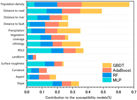 The spatial distribution patterns of landslide susceptibility can be attributable to the spatial characteristics of LCFs (Figure 2). The comparison of relative importance of LCFs is essential to improve the efficiency and the performance of landslide prediction models, and provide implications to policy-makers. In this study, the Gini information gain method was selected to determine the relative importance of each controlling factor. Different models indicated varied major contributing factors (Figure 7). For the RF model, the most important contributor is population density (15%), followed by distance to road (10%). For the MLP model, the most important contributors are slope (17%), relief amplitude (16%) and distance to road (13%). For the AdaBoost model, the major contributing factors are population density (16%) and distance to road (12%). For the GBDT model, the major contributing factors are population density (31%), precipitation (15%) and distance to road (12%). In the thirteen LCFs, RF, AdaBoost and GBDT models agreed well that population density has the largest relative importance. Landform and curvature generally had the minimum relative importance, indicating these two factors had less effect in data fitting and classification. Overall, population density, distance to road, and relief amplitude are generally among the top three major contributing factors for all four models. At town level, our results indicated that the leading contributing LCFs varied significantly. For Daoshi Town, the top three LCFs were population density, distance to fault, and curvature; for Jinnan, the top three LCFs were population density, relief amplitude, and aspect; for Linglong, the top three LCFs were aspect, relief amplitude, and population density; for Qingliangfeng, the top three LCFs were population density, precipitation, and distance to fault. Generally, population density, relief amplitude, and distance to fault were the most important LCFs for the high-risk towns.