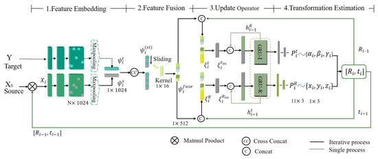Overview of the proposed method. The PointNet-based network first separately extracts the global feature vector (, ) for the current source and the target Y. Then, the feature fusion block fuses global pair-wise features by cross concatenation and learns implicit correspondence () with a 16-sized kernel. After that, the update operator utilizes two GRU units to maintain long-term state information. The input feature is taken as the concatenation of , the (i − 1)th-obtained transformation, and hidden state . Finally, the estimation network is trained to predict a probability distribution of transformation in a sequence using fully connected layers and return the current transformation .