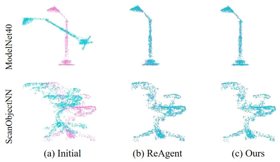 Qualitative comparisons on ModelNet40 and ScanObjectNN dataset. Columns show target (magenta) and source (cyan). (a) shows the initial state. (b,c) show the registration results.