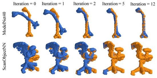 Qualitative examples on the iterative state of ModelNet40. The source (blue) and the target (yellow) aligned over 12 iterations.