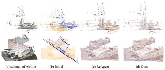 Qualitative comparisons on AirLoc dataset. (a) shows the submap of laser-scanned submap. (b) shows the initial state of point cloud pairs. (c,d) shows the registration results.