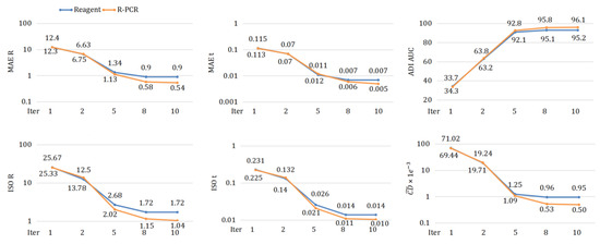 Convergence curve comparison over iterations on AirLoc dataset. We plots two curves on the same graph, for ReAgent and R-PCR, with the number of iterations on the x-axis and the value of the metrics on the y-axis. Over iterations, the value of rotation-based metrics, translation metrics and Chamfer distance decrease, with maximal ADI AUC. Compared to ReAgent, R-PCR shows a better convergence performance.