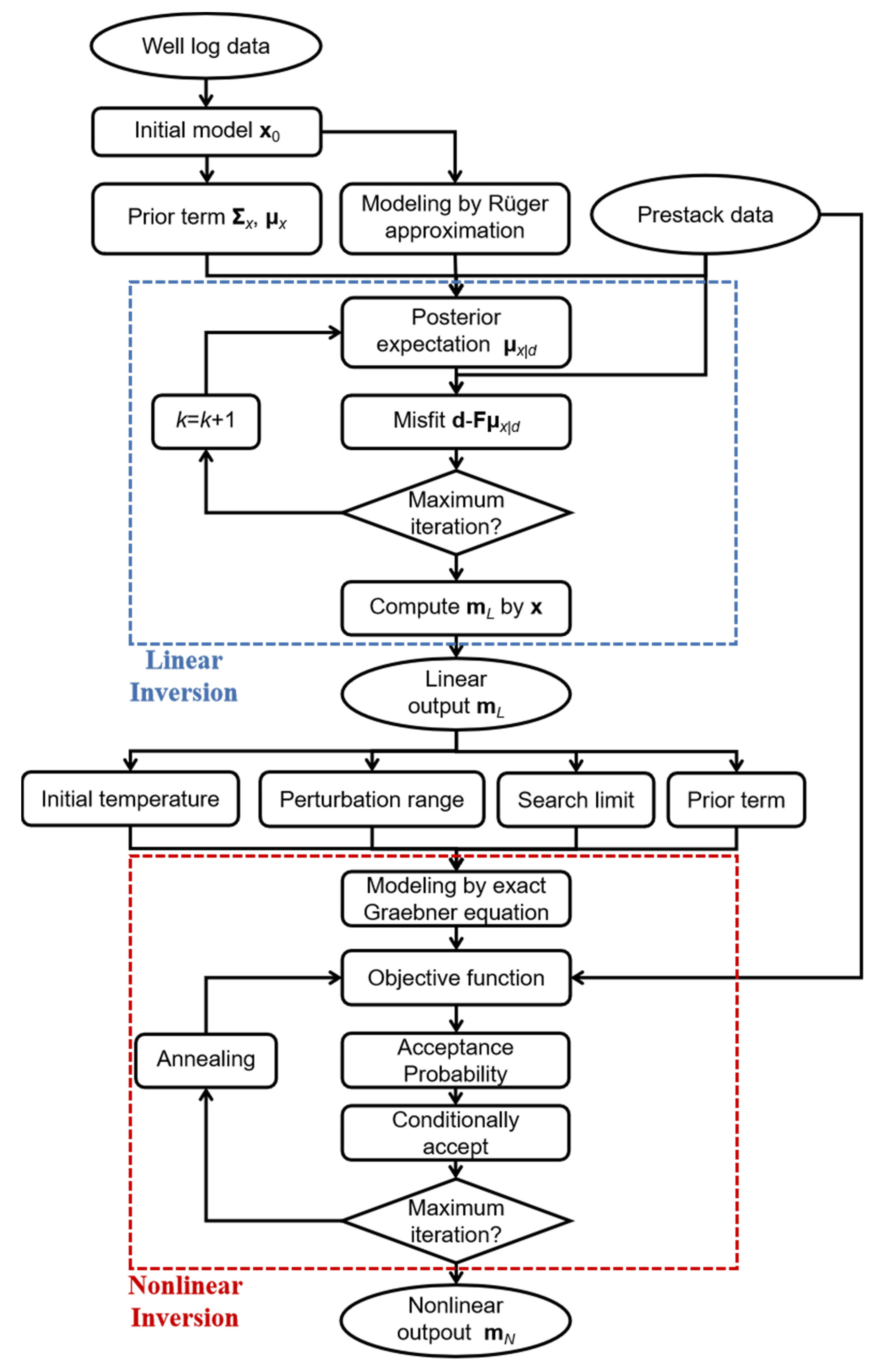 | 3-3. Compute the misfit d-μd. Output the inversion result x = μx|d if the maximum iteration is reached, or x0 = μx|d, and repeat steps 2–3 |