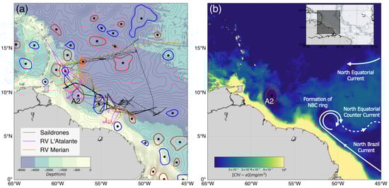 (a) Bathymetry of the tropical Atlantic Ocean (from the ETOPO2 dataset). The region of interest is delineated by the shaded gray square in the upper right panel. The absolute dynamic topography (ADT) contours for 30 January 2020 are shown in gray. The anticyclonic and cyclonic eddies detected by TOEddies are shown as red and blue contours, respectively. The NBC A2 ring discussed in this work is highlighted. The thin lines indicate the trajectories of 2 research ships and 5 Saildrones ™deployed during the EURECA-OA campaign. (b) Schematic of major ocean currents in the western tropical Atlantic superimposed on the 30 January 2020 chlorophyll-a field using the GlobColour gap-free chlorophyll-a product (GlobColour data, accessed on 18 January 2023 (http://globcolour.info) developed, validated, and distributed by ACRI-ST, France). The A2 detected by TOEddies on the same day is shown as red contour.