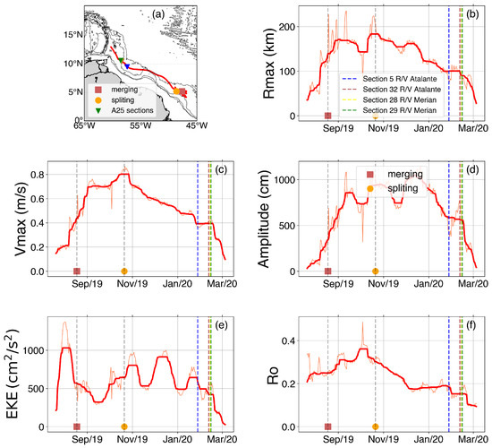 (a) Bathymetry map (from the ETOPO2 data set [52]) showing the trajectory of NBC Ring A2, positions of splitting and merging events, and intersections with the 4 sections performed during the EURECA-OA experiment. Evolution of A2 parameters is shown in the other panels: (b) Radius of maximum velocity, (c) Azimuthal velocity maximum, (d) Amplitude, (e) EKE, (f) Rossby number. The colored vertical bars indicate the date of the four sections performed by R/V L’Atalante and R/V Maria S Merian.