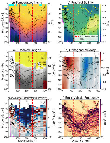 From the available in-situ measurements, we estimated the volume of A2 and the associated mass, heat, and salt transport in the upper layer. The high-resolution data allowed us to derive the Ertel potential vorticity anomaly [39], or EPVa below. This quantity has been shown to characterize coherent eddies in the ocean well (as in [4,59,60,61]). We use it here to define the boundaries of the ring and its volume. By comparison between the EPVa and the potential density anomalies, we chose two isopycnals to define the upper and lower limits of A2: 23.2 kg.m and 25.3 kg.m. They correspond to the green lines in Figure 5. We defined the lateral boundary of the eddy as the limits where the EPVa changes sign, with negative values of EPVa corresponding to the A2 core. These boundaries are shown as a dark purple dashed line in Figure 5. Prior to the volume calculation, we interpolated the EPVa cross-section to a 0.5 dbar and 1 km grid, and performed smoothing using vertical and horizontal cutoff frequencies of 5 m and 10 km, respectively. We assumed that the eddy was axisymmetric. We calculated the volume and property transport for A2 along Section 5 of the R/V L’Atalante as the ship passed through the eddy closest to its center. Heat, salt, and oxygen contents were calculated by integrating the measurements along this section over the bounded volume. We obtained a volume of 4.51 × 10 m and a transport of 0.14 Sv. This value is lower than the CNB ring mass transports estimated previously. Ref. [11] estimated an average annualized transport of 0.8 Sv for surface-intensified NBC rings, and 1.7 Sv for subsurface-intensified rings. However, Ref. [11] focused his transport estimates on the South Atlantic waters for each ring, whereas we calculated the total volume and A2 transport. The A2 mass transport is associated with heat and salt transport of 0.016 PW and 5.3 Sv PSU, respectively (1 Sv PSU kg/s). For comparison, Ref. [26] reconstructed an average NBC ring from in situ measurements and found an average heat transport of 0.07 PW. [8] calculated ring transports ranging from 0.06 PW to 0.10 PW, and the estimated heat transports from the five rings presented in Ref. [21] is 0.036 PW. To allow for more comparisons, we also calculated the A2 volume using 2 additional methods (which are more widely used) to define the ring boundaries. The results are provided in Table 1. The first method is to consider the ring as a cylinder while for the second method we used the location of the maximum azimuthal velocity to define the horizontal boundaries of the eddy (this corresponds to the yellow dotted line in Figure 5). The values obtained exceed in both cases the volume and transport estimates we obtained by constraining the eddy volume with EPVa. This suggests that the published transport estimates may overestimate the transport of shallow NBC rings. For heat, salt, and oxygen contents, we calculated climatological anomalies for the different properties along Section 5 of the R/V L’Atalante using the World Ocean Atlas [62,63,64] as the reference climatology. All anomalies (heat and salt) are positive for A2, except for oxygen.