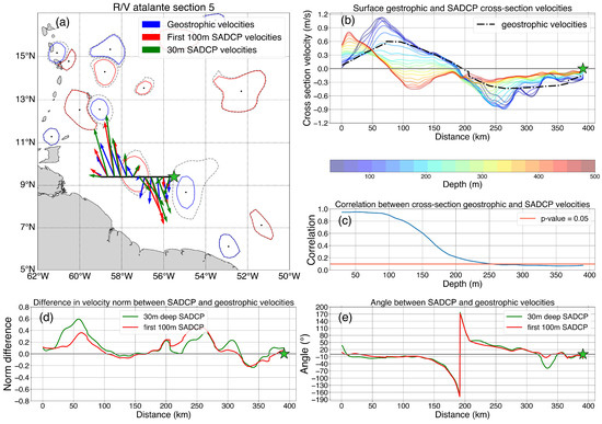 One of the main uncertainties in applying the TOEddies algorithm lies in determining with precision the azimuthal velocity maximum associated with eddies. Applied to satellite altimetry, TOEddies takes as an input the surface geostrophic velocity fields derived from ADT. Here, we test how surface geostrophic velocity derived from ADT and the observed in-situ velocity compare with each other. Ref. [67] showed, using S-ADCP and neutrally buoyant RAFOS floats, that correlation coefficients between altimetry-derived geostrophic velocities and in-situ velocities decrease with depth. Figure 7 shows such a comparison for R/V L’Atalante Section 5. Figure 7a shows the average of the S-ADCP velocities for the upper 100 m in red arrows, for the upper 30 m in green and geostrophic velocities derived from satellite altimetry in blue. The in-situ averaged velocities are larger and follow a slightly different direction than geostrophic velocities derived from satellite ADT maps. Figure 7b presents the intensity of the in-situ velocity along the section at different depths. From 30 m to about 200 m depth (lines in shades of blue), the signal of the surface intensified ring A2 is discernible, whereas from 200 m to 500 m it disappears.