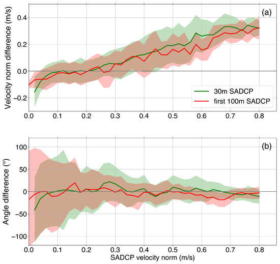 Comparison between S-ADCP and surface geostrophic velocities, derived from satellite altimetry, using all the R/V L’Atalante and R/V Maria S Merian sections with S-ADCP data available until at least 500 m. S-ADCP velocities averaged over the first 100 m are represented in red while S-ADCP velocities at 30 m depth are shown in green. (a) Velocity norm difference (m/s) between S-ADCP and surface geostrophic velocities as a function of S-ADCP velocity norm. (b) Angle difference (°) between S-ADCP and surface geostrophic velocity vectors as a function of S-ADCP velocity norm. On average, the difference lies between −25° and 25°, with a larger variability for smaller values of in-situ velocities.