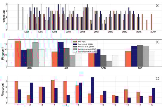 Regarding the monthly variability, we observe in Figure 9b a maximum of ring generation during April, followed by January and May, whereas [25] found a maximum in February, followed by March and June, Ref. [26] in July, June, and February, and [16] in July, August, and February. Ref. [22] presented December and January as months with the highest rate of ring formation, with a year-to-year variability in those months. Although December accounts for a low ring generation in the present study, results for January are consistent. From a model perspective, Ref. [21] showed a maximum modeled generation rate in February, April, and May. Moreover, all previously published works indicate that fall (SON) is the season with the lowest rate of ring generation. As stated by [16,25,28], the seasonality appears to be inconsistent between different years. Despite some differences, especially in terms of identified months with maximum generation rate for NBC rings, our results remain coherent with previous studies.