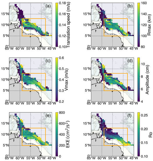 NBC ring mean values for different parameters: (a) Translation speed, (b) Radius max, (c) Azimuthal velocity max, (d) Normalized Rossby number, (e) Kinetic energy and (f) Amplitude. The orange box defines the region where statistics were computed.