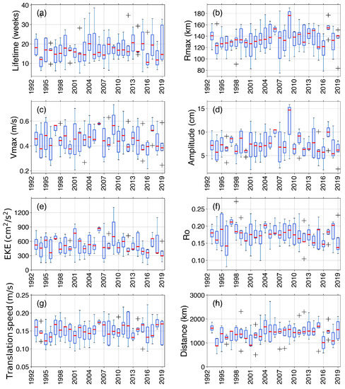 Inter-annual variability of the NBC rings physical parameters during the 27 years of ADT fields. (a) Lifetime, (b) Radius max (c) Velocity max, (d) Rossby number, (e) Kinetic energy, (f) Amplitude, (g) Translation speed, (h) Distance covered. The box extends from the first to third quartile values, with a red line at the median. The whiskers extend from the edges of the box to show the extreme data points, and black crosses are outliers.