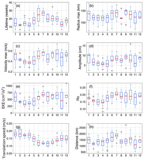 Seasonal cycles of the NBC rings physical parameters during the 27 years of ADT fields. (a) Lifetime, (b) Radius max (c) Velocity max, (d) Rossby number, (e) Kinetic energy, (f) Amplitude, (g) Translation speed, (h) Distance covered. The box extends from the first to third quartile values, with a red line at the median. The whiskers extend from the edges of the box to show the extreme data points, and black crosses are outliers.
