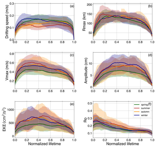 Ensemble mean and standard deviation of NBC ring parameters for each season as a function of a normalized lifetime. (a) translation speed, (b) Radius max (c) Velocity max, (d) Amplitude, (e) Kinetic energy, (f) Rossby number.