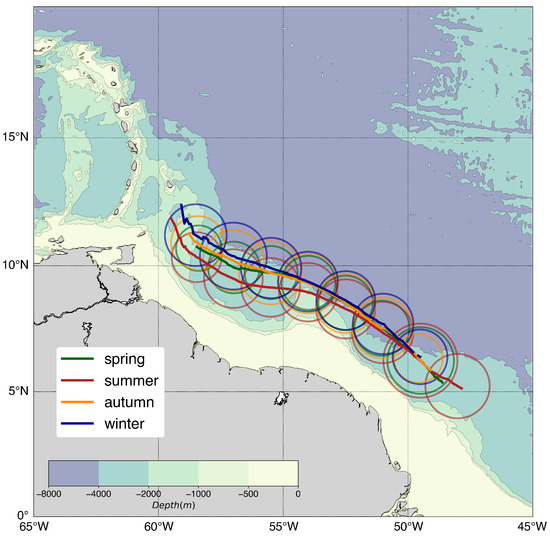 Mean NBC rings trajectories seasonality and estimated contours based on the average radius for each different season (considering rings as circles). Green, red, orange, and blue respectively correspond to rings generated in spring, summer, autumn and winter.