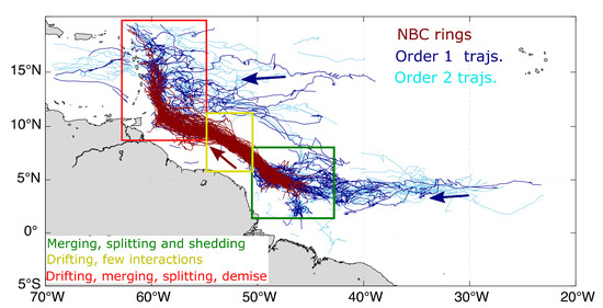 The detection and tracking of eddy merging and splitting in the region allows us to reconstruct the eddy network as defined by [34] (Figure 16) associated with the rings. This provides information on the origins of the eddies involved in merging with NBC rings, as well as the fate of the rings that split. In Figure 16, the eddy trajectories colors depend on the order of the reconstruction: eddies that merged(split) with(from) rings are order 1 trajectories, while eddies that merged(split) with(from) an eddy that previously split from a ring are considered order 2, etc. Our results suggest that a connection might exist between eddies coming from the middle of the Tropical Atlantic Ocean and NBC rings. Eddies originating from 10°N and 20°N might also end up merging with rings or eddies that previously split from rings. Finally, no ring was detected crossing the Lesser Antilles, but several anticyclonic eddies detected inside the Caribbean Sea are considered by TOEddies as linked with ring-splitting events. Although TOEddies finds this connection, the island chain acts as a topographic barrier preventing NBC rings to enter the Caribbean Sea, and it is very unlikely that those direct connections are real. As a matter of fact, Ref. [16] stated, using a geodesic eddy detection method, that NBC rings do not connect the tropical Atlantic and the Gulf of Mexico as coherent material vortices. However, water trapped inside rings can leak in the Caribbean basin through the islands. As a comparison, Ref. [26] used an eddy detection algorithm and detected 2 rings going through the Island chain.