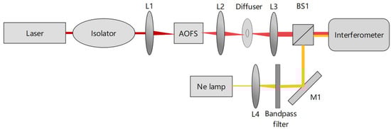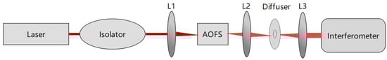 The He-Ne laser used in this setup provides a light source at 632.8 nm with a frequency stability of ±1 MHz, resulting in a wind uncertainty of about ±0.63 m/s. The outgoing light first passes through an isolator to prevent reflected light from entering the laser. Then, the laser beam is focused onto the AOFS by the lens L1 to maximize the modulation efficiency of the RF carrier and to reduce the light transit time. The beam should be incident at the Bragg angle to obtain the maximum diffraction efficiency [21]. The frequency range modulated by the AOFS used here is 100–200 MHz, which can simulate wind speeds in a range of 63.28–126.56 m/s [22]. The lens L2 focuses the beam onto the rotating diffuser to suppress laser speckle, and the lens L3 collimates the laser beam for the interferometer. The simulation of the wind at different speeds can be achieved by adjusting the AOFS.