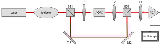 To measure the change in frequency when light passes through the AOFS, a new setup was built, as shown in Figure 2. The laser beam passing through the isolator was divided into two beams using a beam splitter (BS1). One beam passes through the AOFS, and the other one is reflected by two mirrors without passing through the AOFS. Another beam splitter (BS2) mixes the two beams, which are then focused by L3 onto a photodetector integrated circuit (PDIC). The PDIC is a Si-amplified detector that converts optical signals into electrical signals. Finally, the photodetector was connected to an oscilloscope to capture the light-beat signal. The Si-amplified detector used in the experiments had an impulse response time of 1 ns and a bandwidth of 380 MHz. The sampling frequency of the oscilloscope was 1.25 GHz, which allows to detect 100–200 MHz signals. To improve the resolution of the frequency-domain spectrum, it is necessary to ensure a certain sampling time, which was 1.25 ms per sample in the experiment, corresponding to a frequency resolution of 0.8 kHz.