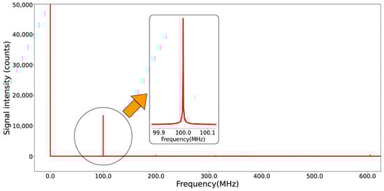 The light-beat frequency can be obtained using a fast Fourier transform (FFT) with the amplitude of the signal captured by the oscilloscope. As shown in Figure 3, with a 100 MHz frequency shift, for example, a spectral peak can be easily detected, and the corresponding frequency is shown in the horizontal axis in the figure. Here, the energy of the DC term is much higher than the energy of the target frequency, most likely because the light of the two frequencies does not exactly overlap on the detector, allowing for a greater collection of light from a single frequency.