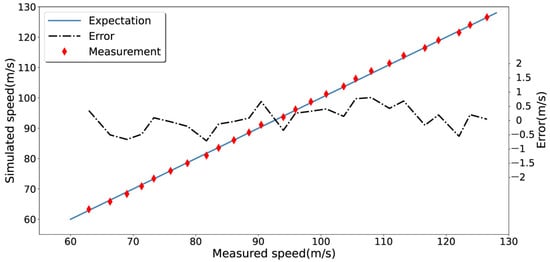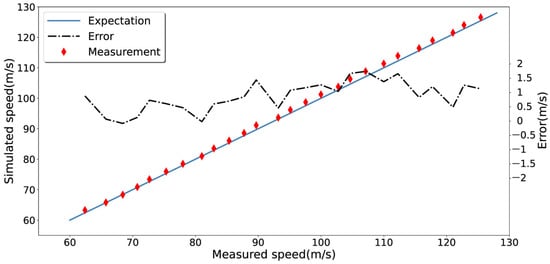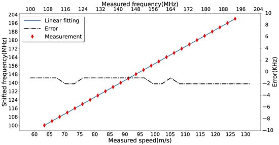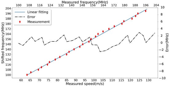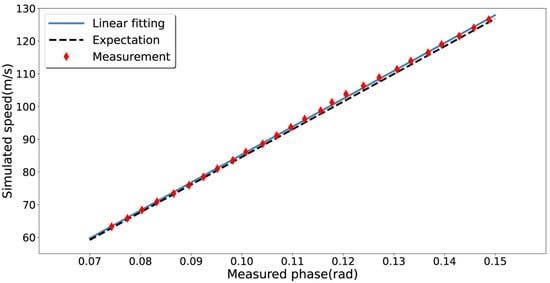 According to Equation (1), we used the remaining nine groups of data to fit a more precise factor of the coefficient . Figure 9 shows the average of measurements and their linear fitting result, where an expectation line is also given for comparison and the slope of it represents the designed sensitivity. Please note that each data point in the figure is an average value of nine retrieved Doppler speeds. The calibrated factor changes to .