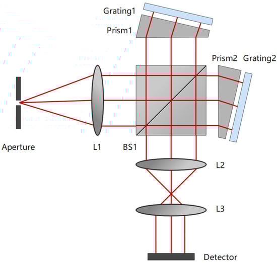 We use the setup presented above to calibrate a newly built ASHS-type interferometer (Figure 6, Wei et al., 2020) [25]. As shown in Figure 6, an approximate plane wave entering the interferometer is divided into two beams by the beam splitter BS1. After going through the fixed prisms for enlarging the field, they are diffracted at the two gratings, respectively. Then the two reflected beams are combined and recorded by the detector as an interferogram that carries the frequency of the light source. The asymmetry of the two interferometer arms allows for the detection of small frequency changes in the input signal as phase shifts in the interferogram. The wavelength shift can be calculated from the phase using the Fourier transformation. Wind speed can be calculated from the phase shift by the following expression [15]: