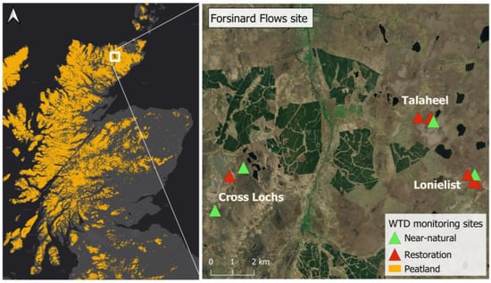 Peatland extent in northern Scotland [23] and the chosen study sites in the Forsinard Flows. The green triangles show the near-natural peatland study sites, and the red triangles show sites with ongoing restoration.
