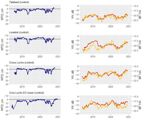 The correction in these studies was based on the day of the year of the radar image acquisition and the approximate day when the growing season begins. We found that accounting for the seasonal greening up of vegetation with a sine function can alter the data in an inappropriate manner by inflating the backscatter values, and therefore, also the model fit (see Supplementary Figure S1). More advanced vegetation corrections have been proposed for Sentinel-1 data normalization to account for the vegetation structure and vegetation water content change throughout the year in agricultural areas and grasslands [42] and managed grasslands with peat soils using the cross-over angle concept [17]. However, normalization has resulted in only marginal improvement in these studies. Bechtold et al. [15] found that the cross-over angle concept significantly improved the correlation coefficients between the radar backscatter and the observed water table depth; however, this method requires a radar instrument that measures backscatter simultaneously at multiple angles, which is not applicable for Sentinel-1. One promising avenue for making growing vegetation corrections is to combine data from the optical and microwave domains and retrieve the vegetation and soil water states simultaneously [43]. We intend to explore such techniques in future peatland research. To respond to the nature and climate crisis, governments worldwide, including the UK, have set ambitious goals for peatland restoration in the coming years. This in turn has highlighted the need for effective peatland monitoring tools, and earth observation data, such as the satellite imagery from Copernicus programme satellites, have already shown promising results. In this study, we investigated water table depth monitoring possibilities using Sentinel-1 SAR data and three different modelling approaches. Although already promising results were achieved in this study, future studies should investigate if the models’ performance is maintained when applied to other peatland sites outside of the study region, and at later stages, if more complex models, additional input variables, and higher resolution SAR data can improve the modelling performance.