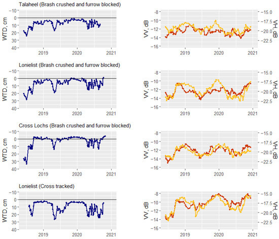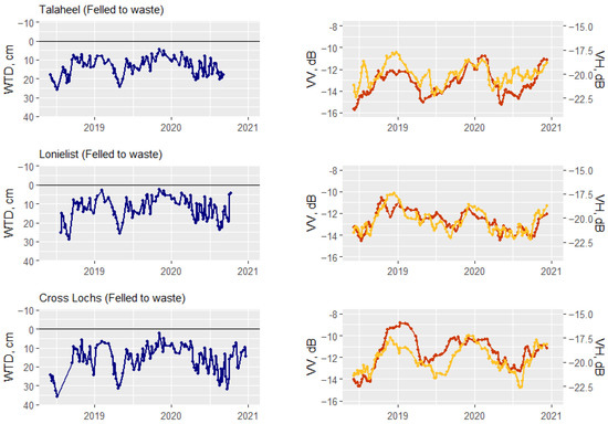 Observed water table depth (left) and Sentinel-1 ((right); VV in red, VH in yellow) backscatter time series for peatland sites with simplistic restoration (felling to waste) applied. The black horizontal line indicates the ground surface.