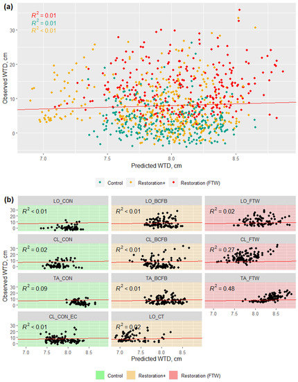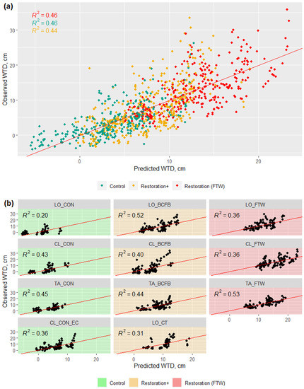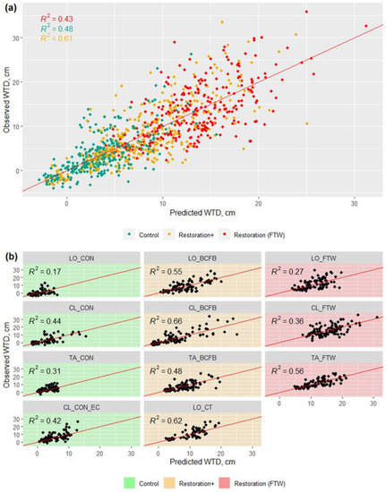 A multiple linear regression (MLR) model was fitted to estimate the WTD using VV and VH polarization backscatter and four categorical variables: season and year of radar image acquisition, area investigated, and the condition group it belongs to. For the combined data input, the MLR model yielded R2 = 0.59, with very similar scores for all condition groups (R2 = 0.46 for the Control and Restoration (FTW) groups and R2 = 0.44 for the Restoration+ group) (Figure 7a and Table 4 in Section 3.2.3). When applied to sites individually, moderate agreement between the observed and predicted WTD was found at 2 sites (R2 > 0.5), weak agreement (0.3 < R2 < 0.5) at 8 sites, and very weak agreement (R2 < 0.3) at 1 site (Figure 7b).