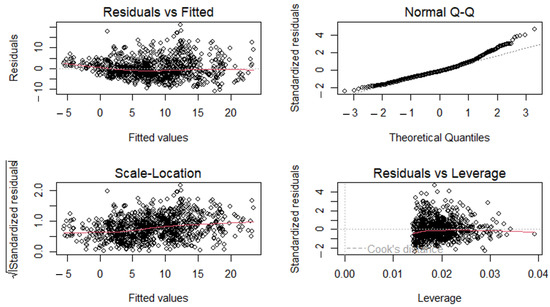 MLR model residual statistics. Clockwise from upper left: (1) Comparison of the residuals of the MLR model against the fitted values produced by the model, the red lines indicate a LOWESS fit; (2) quantile–quantile plot: confirms that both sets of quantiles came from the same (normal) distribution, except the upper quantiles, where the points stray above the line, indicating some deviation of the error from normality; this, however, is a small portion of the data; (3) scale–location plot: uses the square root of the standardized residuals instead of the residuals themselves; (4) leverage plot: no standardized residuals are outside of the Cook’s distance boundaries, indicating that there were no strong outliers influencing the regression results.