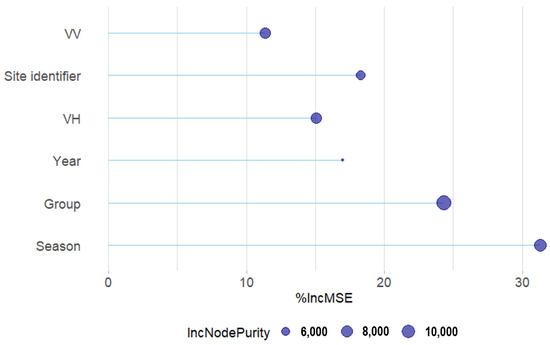 Finally, the random forest model was applied, using the same input variables as for the MLR model. Good agreement (R2 = 0.66) was found between the observed and predicted WTD when looking at the combined data, and out of the three condition groups, it was found to be highest for sites with more advanced restoration methods applied (R2 = 0.48 for the Control, R2 = 0.44 for the Restoration (FTW), and R2 = 0.61 for the Restoration+ group) (Figure 9a and Table 4). When applied to sites individually, moderate agreement between the observed and predicted WTD was found at five sites (0.65 < R2 < 0.5), with weak agreement (0.3 < R2 < 0.5) at four sites, and very weak agreement (R2 < 0.3) at two sites (Figure 9b). The RMSE score was further decreased compared to the two linear models, with RMSE = 2.1 cm (training data). When running the model on the validation data, the correlation slightly decreased, and the deviation of the residuals increased (R2 = 0.60, RMSE = 4.2 cm). The variable ranking, starting with the most important, were the season, group, year, VH, site identifier, and VV (Figure 10).