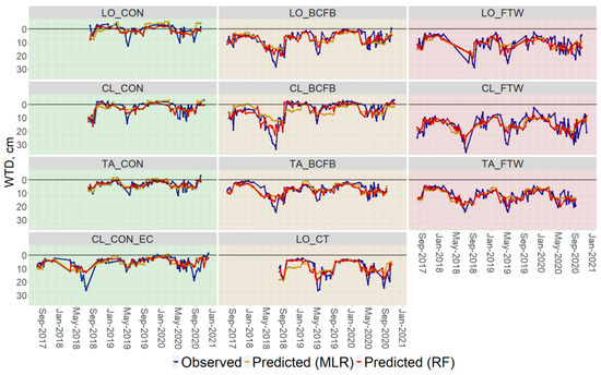 Modelled and observed water table depth series based on the MLR and RF models. The black horizontal line indicates the ground surface. Panels with a green background indicate the control sites, orange—Restoration+ sites, and red—Restoration (FTW) sites.