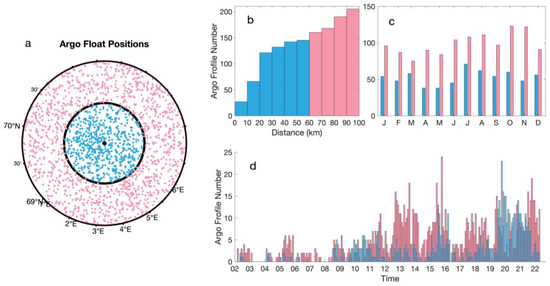 Around the CCLV, 69.8°N and 3.3°E, the Argo profile number in the center zone is approximately 30, with a radius of 10 km, while it is approximately 60 in the first ring, with a radius of 10–20 km, and slightly increases from 120 to 200 in the successive rings, with a radius difference of 10 km, ranging from 20 km to 100 km (