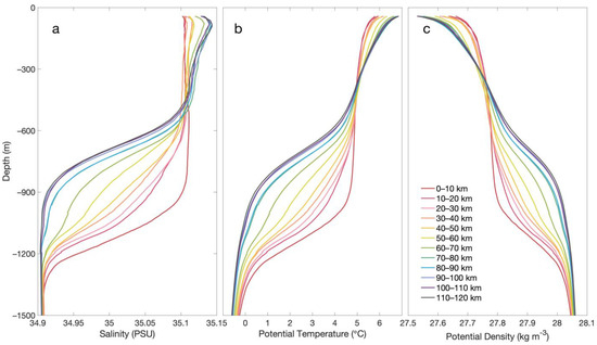 Generally, with an increasing depth from 20 m to 1500 m, the salinity range within the LV (0–60 km) ranges from 35.1 PSU to 34.9 PSU, the potential temperature ranges from 6 °C to −0.5 °C, and the potential density ranges from 27.6