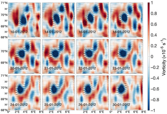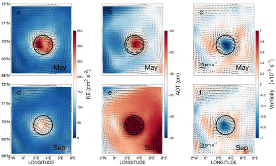 Figure 1b–d). The LV is an anticyclonic eddy located at approximately 70° N and 4° E in a region of the sea with a depression in terms of its topography. Its average radius is around 37 km, and it has an average tangential velocity of approximately