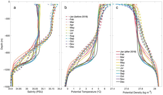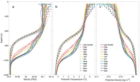 Figure 2c). The climatological monthly salinity, potential temperature, and potential density profiles are presented in