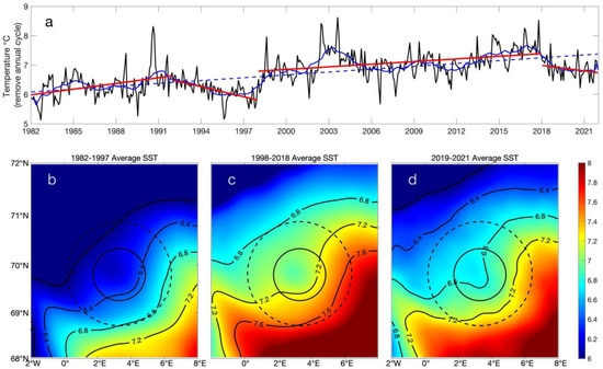 Figure 9a). The 24-month moving average SST time series shows periodic fluctuations in an increasing trend. This trend shows increases of approximately 1.5 °C/40 years throughout a period from 1982 to 2021. Although limited by the length of the time series, the wavelet analysis still shows that the SST covers a significant period of 8–16 years. In the low-frequency range, we can divide the periods into 1982–1997, 1998–2011, and 2012–2021. The stages of increasing warming include 1982–1991, 1998–2003, and 2012–2017. The stages of decrease toward cooling include 1992–1997, 2004–2011, and 2018–2021. The first stage, 1982–1991, is one of inclination toward warming, but the temperature value is at the lowest point in the trending line. To avoid the inefficient effect of periodic averaging, we divided the periods into new stages depending on whether they were above or below the trending line.