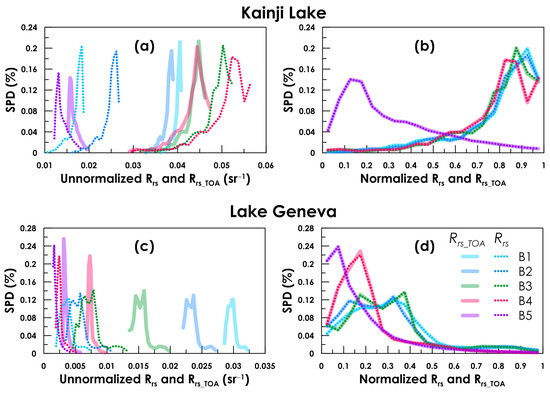 To compare different SPDs of various water bodies in nature, it is common practice to normalize them into the same range, because, in remote sensing inference, we focus mainly on the key statistical characteristics of SPD rather than their magnitudes. This is similar to topology, where the shape of an object is sometimes the only concern, regardless of how it is scaled or shifted. If the SPDs of two lakes are both normal distributions, but with different means and standard deviations, then the two SPDs are the same in form because one normal distribution can be scaled and shifted to the other normal distribution. In remote sensing statistical inference, max-min normalization (linear normalization) is used to scale and shift Rrs of different waters into the same range 0–1 [1,16], using the following equation: