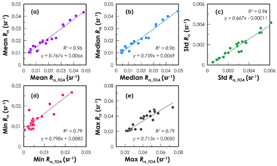 Relationships between the statistical parameters ((a) mean, (b) median, (c) std, (d) min, and (e) max) of unnormalized Rrs and Rrs_TOA for the 24 water bodies at the B3 band (555 nm) of Landsat-8.