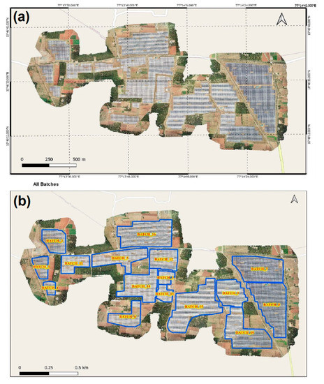In this research, the study area was a Solar field of 55 MW in the Southern part of India, situated on Arakkan Ittery Rd, Moongiltholuvu, Tamil Nadu State of India. The geographic coordinates of the study area are 10°46′37.5″N 77°13′58.8″E. The whole solar park was divided into six blocks with five blocks of 10 MW power and 5 MW power. The aerial survey of the park was conducted in the last week of February 2021, and the aerial orthomosaic of the solar park is shown in Figure 1a. To capture the solar park with a thermal camera mounted on an Unmanned Aerial Vehicle (UAV), sixteen flight paths were required. The flight of the drones was kept during the daytime so that the panels could be charged at 25, and the operational condition and the temperature of excellent and defective cells could be noted down with the help of the thermal camera mounted on the drone. The sixteen batches covering the area of the park are shown in Figure 1b.